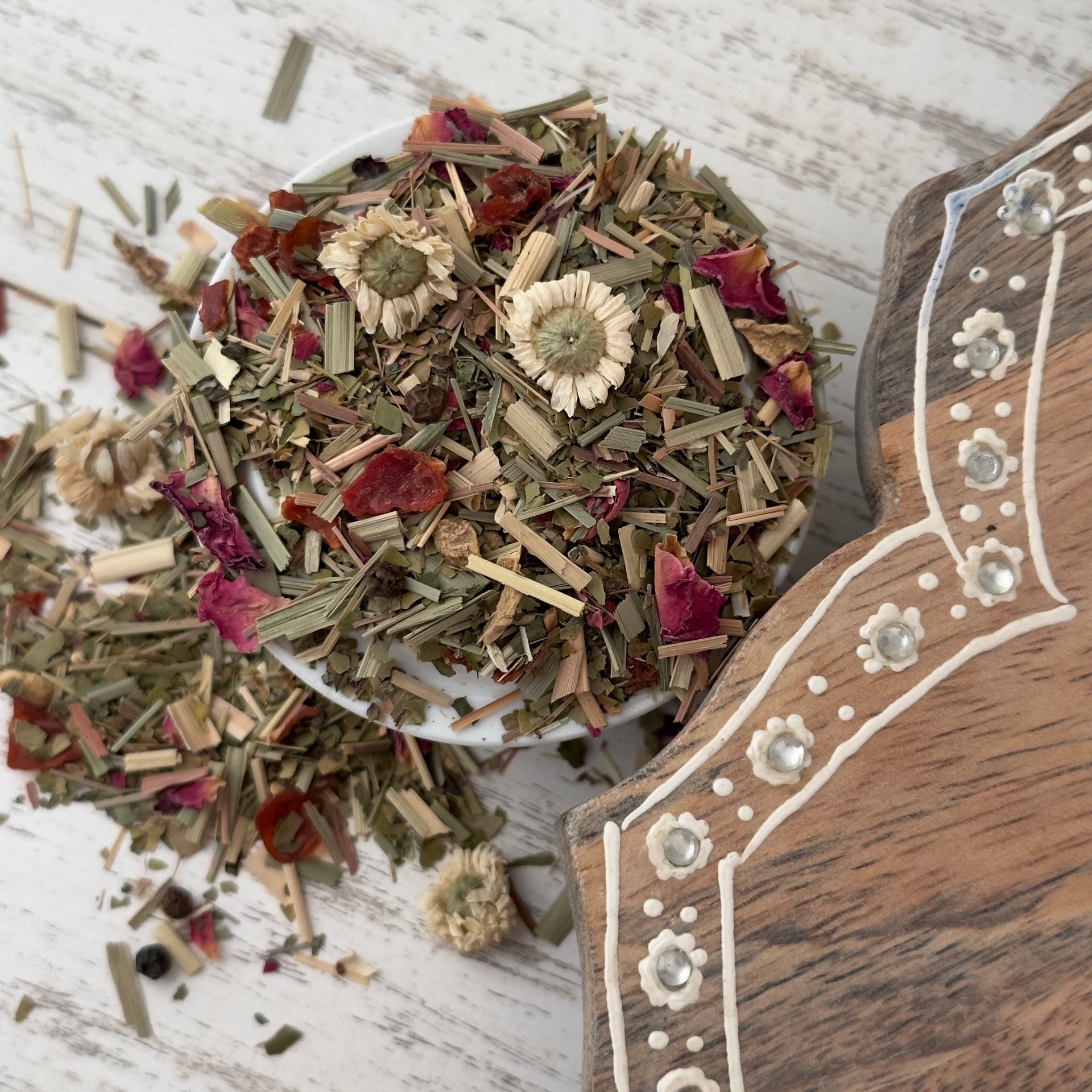 An Artisan blend with Green Mate Tea, Lemongrass, Rosehip peel, Ginger pieces, Black peppercorns, Cardamom, Basil, Rose petals, & Roman chamomile.