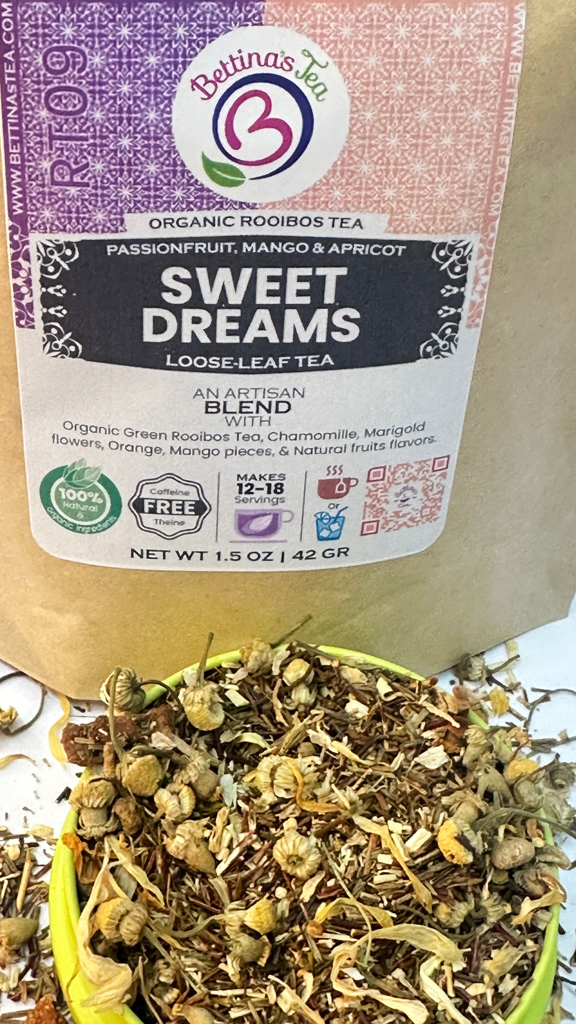 An Artisan blend with Green Rooibos Tea, Chamomille, Marigold flowers, Orange, Mango pieces, & Natural fruits flavors.